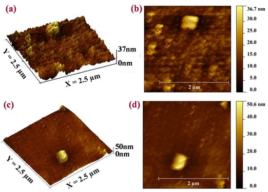 AFM analysis was carried out to evaluate the surface topography of the Cu-coated film. Figure 10 demonstrates the AFM analysis of the Cu film of category-1 with 5 min sputtering time. Overall uniform coating of Cu was obtained by using the given parameters, and AFM images suggest the average coating thickness is 19.8 nm, as shown in Table 4. Figure 10a,b shows the uniform distribution of Cu particles throughout the surface of the scanned surface where the size of maximum film thickness is ~37 nm. The Cu particles are connected with each other and the anticipated long mean-free path is well developed for enhanced conduction. Figure 10c,d reveals the selected area of individual Cu island, which has grown to a maximum height of ~50 nm. Despite the formation of individual islands, the average roughness behavior remained similar, as summarized in Table 4.