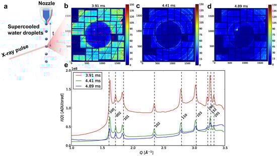 (a) Schematic of the experimental setup used to probe ice growth in micron-sized water droplets upon deep supercooling as function of travel time t in vacuo. Virtual powder X-ray diffraction patterns from all ice hits recorded at (b) 3.91 ms, (c) 4.41 ms, and (d) 4.89 ms. (e) Mean radial WAXS profiles for all diffraction images containing Bragg peaks. The dashed lines show the expected locations of the Bragg peaks for hexagonal ice Ih []. The high degree of overlap and the distinctive triple peaks between 1.6–1.85 Å−1 show that the majority of the ice we observed in this experiment is hexagonal ice Ih.