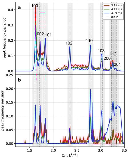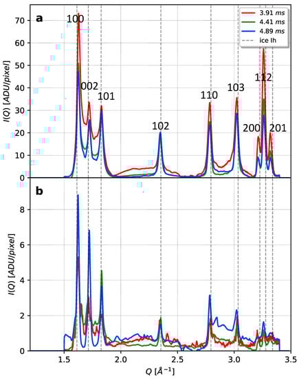 The ensemble average of all ice hits at each of the three measured distances was produced to generate a virtual X-ray powder diffraction pattern (Figure 1b–d). Figure 1e shows the radial profiles of these three virtual powder diffraction patterns together with the Bragg peak locations of hexagonal ice [] named after their Miller indices. Two sub-ensembles were created, based on a threshold in maximum intensity of the radial profile of 50 ADU/pixel, denoted “strong hits” (≥50 ADU/pixel) and “weak hits” (<50 ADU/pixel). The corresponding radial profiles of each sub-ensemble were background-subtracted with a quartic (i.e., fourth order) polynomial at specific Q-positions far from Bragg peaks between 1.5–3.4 Å−1. The background-subtracted radial profiles are shown in Figure 2a,b, respectively. Hit and peak statistics for each sub-ensemble are given in Table 1.