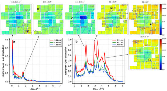 Peak-pair distributions as a function of a center of mass difference in reciprocal space () for (a) shortest and (b) all peaks in the ice hits above 50 ADU/pixel. Random hits that contain the most probable (1.55–1.75, 2.8–2.95 and 3.2–3.5 Å−1) are shown as examples. The black-marked peak in each shot is the reference peak and the correlated from the reference peak to the other neighboring peaks in the same shot is written on top of each corresponding peak.