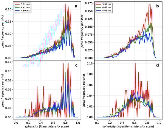 Frequency of a peak appearing with a certain sphericity for the (100) direction for the hits above 50 ADU/pixel (a) in linear and (b) in logarithmic intensity scales as well as the hits below 50 ADU/pixel (c) in linear and (d) in logarithmic intensity scales.
