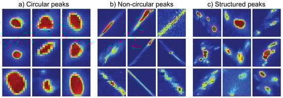 Different classes of peaks: (a) circular peaks that are peaks with one local maximum, a sphericity higher than 0.7 and of at least 0.2 Å−1 to the nearest peak in reciprocal space; (b) non-circular peaks that are peaks with one local maximum, a sphericity lower than 0.3 and of at least 0.2 Å−1 to the nearest peak in reciprocal space; and (c) structured peaks that have several maxima or single peaks that have of less than 0.2 Å−1 to the nearest peak. All peaks are shown from 0 to 5000 ADU in a non-perceptual (jet) colormap.
