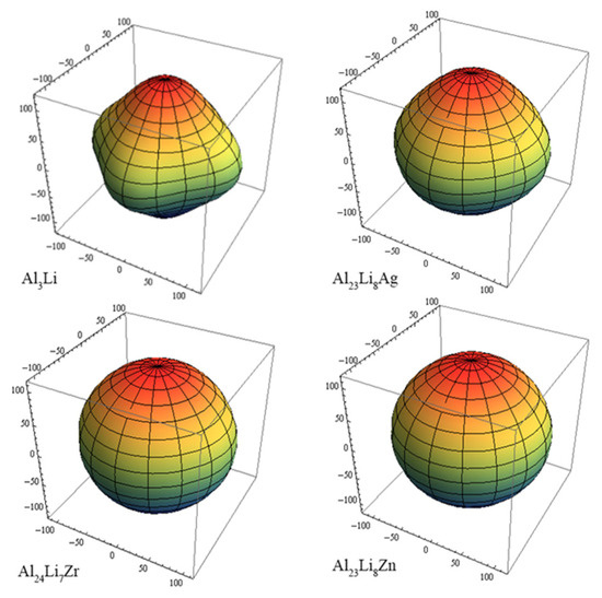where, Sij represents the elastic compliance coefficients of pure and doped Al3Li, and l1, l2 and l3 stand for the directional cosines corresponding to the x, y and z axes. If the 3D surface diagram is spherical, it indicates that the phase shows isotropic behavior. Otherwise, the phase exhibits anisotropic behavior. As plotted in Figure 2, the 3D surface diagrams of pure and doped Al3Li deviate from the sphere, which match well with the results of AU. The 3D surface diagram of Al24Li7Zr and Al23Li8Zn are close to the sphere, especially Al24Li7Zr.