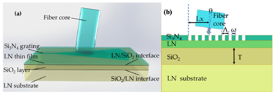 The structure of the Si3N4 strip-loaded grating coupler on LNOI that was studied from the top to bottom layers included a 0.3-μm-thick Si3N4 strip, a 0.5-μm-thick x-cut single-crystal LN thin film, an amorphous SiO2 cladding layer, and an LN substrate. The cross-sectional diagrams of the grating coupler are shown in Figure 1. The fiber fundamental transverse electric mode (TE0) was used as the light source to simulate the coupling process between the grating coupler and the optical fiber. Considering the single-mode operation, the small mode effective area, the optical power in the LN thin film, and the bending loss, the thickness of the Si3N4 strip-loaded grating coupler was selected as 0.3 μm [20], and it was fully etched. The thickness of the LN film was set to 0.5 μm. The parameters Λ, DC, T, Lx, Ly, and θ were varied to maximize the light coupling in the waveguide from the single-mode fiber.