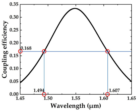 The relationship between the coupling efficiency and the wavelength is shown in Figure 2. The coupling efficiency is half of the peak value when the wavelengths of light are 1.494 and 1.607 μm. The −3 dB bandwidth is 113 nm. The simulation results show that the Si3N4 strip-loaded grating coupler on LNOI has a larger −3 dB bandwidth compared with the silicon strip-loaded grating coupler on LNOI [27].