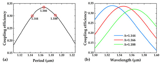 The relationship between the coupling efficiency and the grating period is shown in Figure 3a. When the grating period varies to 1.166 μm, the coupling efficiency reaches its maximum value. The coupling efficiency remains above 30% when the grating period deviates by 0.022 μm. The relationship between the coupling efficiency and the wavelength at different periods is shown in Figure 3b. The coupling efficiency at a wavelength of 1.55 μm corresponds to the red circles in Figure 3a. The peak of the coupling efficiency is red-shifted when the period increases, and it moves in the opposite direction when the period decreases.