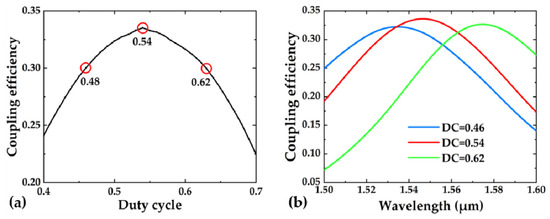 Figure 4. (a) Coupling efficiency as a function of the duty cycle. (b) Coupling efficiency as a function of the wavelength at different duty cycles.
