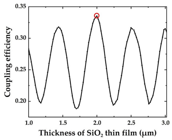 The relationship between the coupling efficiency and the SiO2 cladding layer thickness is shown in Figure 5. The curve of the coupling efficiency oscillates periodically between the maximum and the minimum as the thickness of the SiO2 cladding layer increases. The periodic variation of the coupling efficiency stems from the constructive or destructive interference between the upward reflected light from the LN/SiO2 interface and the SiO2/LN interface.