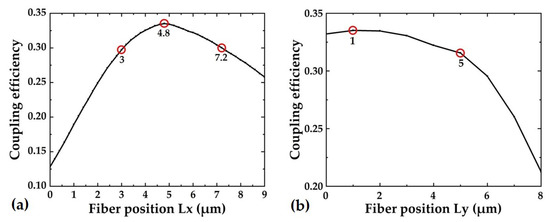 Figure 6a,b shows the coupling efficiencies as functions of Lx and Ly, respectively. Since the grating coupler is symmetrical in the y-direction, only half of Ly is simulated. The coupling efficiencies reach their peaks when Lx and Ly are set at 4.8 μm and 1 μm, respectively. The coupling efficiency decreases faster when Lx decreases than when Lx increases. The coupling efficiency decreases to 30% when Lx is 3 μm and 7.2 μm. When Ly is less than 5 μm, the coupling efficiency is almost unchanged. However, the coupling efficiency begins to decrease rapidly when Ly is 6 μm, while the coupling efficiency decreases sharply to 29%.
