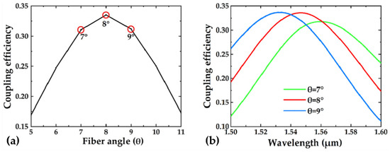 Figure 7. (a) Coupling efficiency as a function of the fiber angle. (b) Coupling efficiency as a function of the wavelength at different fiber angles.