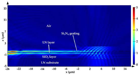 Silicon nitride (Si3N4) has a wide transparent spectrum and high compatibility with the standard complementary metal oxide semiconductor technology [13,14]. It is difficult to etch directly on LN. However, this situation can be avoided by using Si3N4 strip loading. Si3N4 strip-loaded LNOI can make use of the properties of Si3N4 and LN, leading to heterogeneous photonic devices. Various photonic devices have been reported in Si3N4 strip-loaded LNOI, including a multiplexer [15], a micro-ring resonator [16], and an electrooptic modulator [17]. A large bandwidth can be obtained by using Si3N4 grating couplers, such as Si3N4-on-SOI grating couplers [18,19]. Modeling and simulation are indispensable steps in preparing high-quality grating.