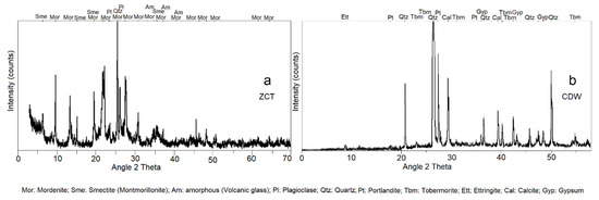 The absence of Na2O and the low content of K2O is a positive indicator that highlights the good quality of the researched CDW, mainly since the low presence of alkaline compounds could prevent their harmful influence on the structural stability of the specimens studied [40]. On the other hand, the high LOI values, calculated for the CDW and ZCT samples, point to these materials as being chemically reactive [41].