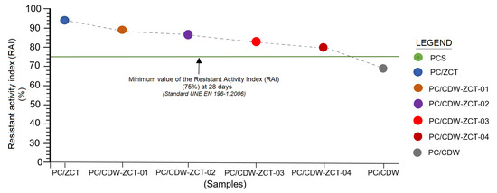 According to Figure 4, the mechanical strength value of the PCS specimen at 28 days is 55.0 MPa, which represents the reference value by which the RAI of the remaining specimens were calculated. In the graph in Figure 5, there is a continuous green line which indicates the minimum percentage which is at 75%; all samples located above the green line comply with the RAI, according to the limits imposed by Standard UNE-EN 196-1:2018 [32], the opposite is true when the sample is below the line, as is the case in the PC/CDW specimen. Therefore, all the specimens analysed have a positive RAI except the PC/CDW, which makes these specimens ideal to carry out the objectives of this work.