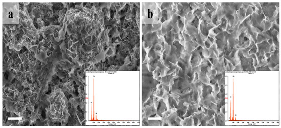 FE-SEM micrographs of (a) pristine LDH and (b) sample obtained at 300 °C calcination; scale bar of 1 μm.