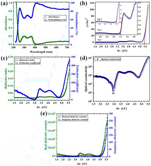 herein, is the absorption coefficient, is the constant value while denotes the energy of the photon, and is the energy bandgap. Three energy bandgaps (5.18, 3.6, and 3.2 eV) were noticed (Figure 3b), which can be attributed to the formation of multiple phases, as demonstrated in the XRD analysis. This is reflected throughout the absorbance spectra findings. The refractive index, which is a measure of spectral dispersion and the extinction coefficient, is calculated according to Equations (2) and (3), respectively [9,30]: