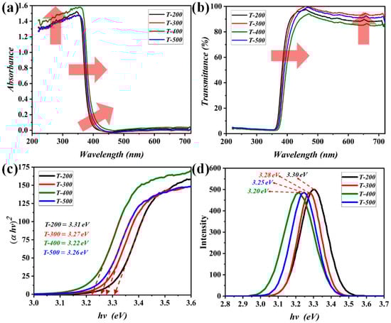 Figure 4 presents an optical validation of the deposited films at different calcination temperatures. A noticeable cut-off phenomenon for all films, in the optical absorbance spectra, was preserved at around 380 nm (Figure 4a). However, there is a slight bathochromic shift (redshift) in the presented absorbance curves, as indicated in the figure. This was noticed alongside a hyperchromic shift throughout the UV region. All deposited films continuously revealed transmittance spectra with almost similar behavior throughout the scanned wavelength (Figure 4b). A pronounced alteration in the transmittance amount ranging between 85–95% was acquired, with respect to the calcination temperature; this in turn responds well to a considerable TCO criteria [32]. A digital photograph is demonstrated in Figure 5, which indicates a sizeable transparency of the deposited T-400 film; the lowest transmittance value. The fabricated films demonstrate considerable anode materials property for optoelectronic applications through the obtained transparency, which in turn may result in enhanced photon energy absorption onto the active layer in the addressed application. The optical bandgaps of the deposited films are elucidated in Figure 4c,d using UV-Vis and PL techniques, respectively; the former was estimated using the Tauc relation [29] while the latter was evaluated directly from the PL spectra. In detail, a reduction in the optical bandgap values was observed, inset in Figure 4c, as the calcination temperature increased, before being further increased at T-500. Similar behavior was noticed in Figure 4d, with respect to the optical bandgap values. Further, the attained calcined layers demonstrated lower optical band gap values compared to those observed in the pristine sample (Figure 3b).