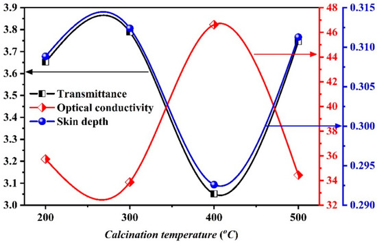 Variation of transmittance, optical conductivity (×107), and skin depth at a wavelength of 385 nm as a function of calcination temperature.