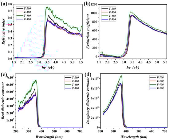 Variation of (a) refractive index, (b) extinction coefficient, (c) real, and (d) imaginary dielectric constant of the deposited film at different calcination temperatures.