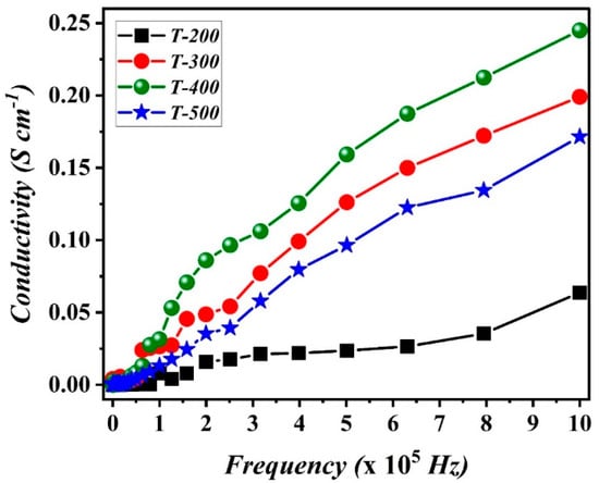 In general, the demonstrated conductivity trend (Figure 8) shows a total dependency of the estimated electrical conductivity of the deposited layers on the utilized frequency range. As the calcination temperature increased from 200 to 400 °C, a higher conductivity profile of the deposited film was observed. The conductivity outcomes, to a certain extent, agree well with the ones obtained in the optical band gap analysis. This in turn could be understood through the demonstrated optical band gap alignment, wherein higher photoexcitation is attained at a lower optical band gap value. The latter was proven via the conductivity enhancement at a higher calcination temperature. Continuously, Table 1 represents the average resistance, resistivity, and conductivity of the deposited MMO films. It can be clearly seen from the mentioned table that increasing the annealing temperature led to higher conductivity. In comparison to the reported electrical conductivity of nanocrystal ZnO (7.3 × 10−7 S cm−1), the addition of Al+3 in our proposed matrix revealed substantial improvement in the electrical behavior (2.37 × 10−2 S cm−1) of MMO films [9]. In the meantime, the highest sheet resistance obtained was found to be 7.43 × 104 Ω/sq for T-400 film. It was reported that the optimum sheet resistance was found to be 2.4 × 106 Ω/sq for a similar matrix using the sol–combustion technique [34]. Meanwhile, the resistivity for TCO ZnO was found to be 2.8 × 103 Ω/sq using the atomic layer deposition approach [35]. Using the sol–gel method, the optimum sheet resistance of Al-doped ZnO was reported to be 156 Ω/sq [36].