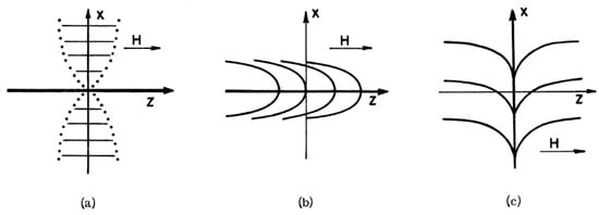 The study of solitons in LCs was started in 1968 by Wolfgang Helfrich []. He theoretically modelled alignment inversion walls as static solitons in an infinite sample of nematic order. By applying a magnetic field, H, depending on the assumed orientation of the director at infinity, there are three types of possible walls, i.e., twist wall, splay-bend wall parallel to the applied field, and the splay-bend wall perpendicular to the field, which are analogous to the Bloch and Neel walls in ferromagnetics (Figure 1). Such a model was later improved by de Gennes who studied the boundary effects of the substrate and the movement of the walls [].