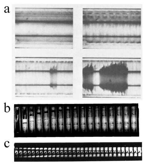 The interactions between flows and director field in a nematic LC can introduce a nonlinear term in the director equation of motion. Thus, it is possible to induce solitons by shearing nematics without applying any external field []. In 1976, Cladis and Torza reported propagating solitary wave instabilities of a nematic in a Couette flow field []. They found that for small shears, a “tumbling” instability was observed, which was similar to the appearance of a solitary wave in a long torsion bar to which is attached a dense array of pendulums. By slightly increasing the shear rate, a cellular flow instability was induced (Figure 3a). Further increase of the shear rate, led to a dense mass of disclinations being formed, which aligned with their long axis parallel to the flow field. At very large shear rates, Taylor vortices were generated. In 1982, Zhu reported a soliton-like director wave in a nematic by mechanical shearing []. In his work, the nematic film was confined in a home-made cell with an exciter at the entrance. The nematic was homeotropically aligned. By moving the exciter, propagating director waves were observed through polarized white light as black lines, which travelled through the nematic bulk (Figure 3b). It should be noted that these solitons were first theoretically predicted and explained by Lin et al. [,,]. Later, in 1987, C. Q. Shu et al. reported the generation of two-dimensional (2D) axisymmetric propagating solitons in a radial Poiseuille flow of homeotropic nematic LCs []. These solitons appear as dark rings in polarized white light and are large enough to be observed directly by the naked eye (Figure 3c). They are generated by periodically pressing the rim of the cell and can move through the nematic bulk at a constant speed with their shape remaining unchanged.