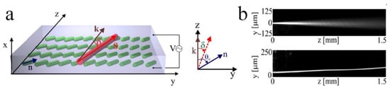 (a) Schematic of the formation of a nematicon in a planar nematic LC cell. (b) Photographs of a propagating ordinary light beam (top) and a nematicon (bottom). Reprinted with permission from Ref. []. Copyright 2019 Optical Society of America.