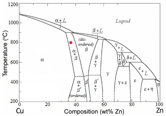 Brasses are Cu–Zn alloys that contain different amounts of zinc, which have considerable applications in various industrial areas due to their special physical and mechanical properties. For example, they possess high thermal conductivity, considerable corrosion resistance, and a good combination of mechanical performances such as tensile strength and ductility []. It is notable that Zn plays the main role in determining the final properties of brasses, as it changes the microstructure at different concentrations. For example, at Zn < 37 wt. %, brasses only contain an α phase, which has a face-centered cubic (FCC) crystallographic structure. On the other hand, at Zn > 37 wt. %, the ordered β phase with a body-centered cubic (BCC) structure appears in brasses at room temperature, which causes an increase in strength. A disordered β phase transfers to an ordered β phase during equilibrium cooling at about 454 °C [].