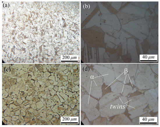 OM images of the single-phase (a,b) and double-phase (c,d) brasses at low and high magnifications. The magnification of (a,c) is 200×, and the magnification of (b,d) is 1000×.