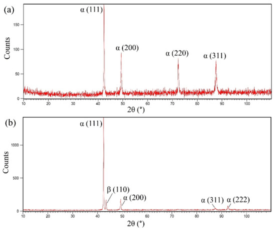 XRD results of the single-phase (a) and double-phase (b) brasses showing the β (110) peak after heat treatment in double-phase sample.
