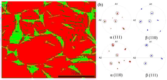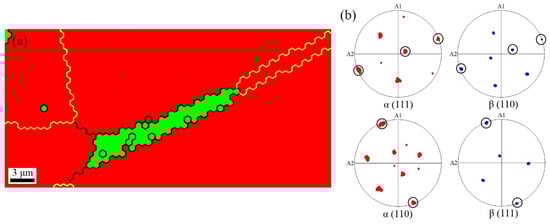 (a) Phase map of the double-phase sample at higher magnification. (b) (110) and (111) pole figures of α and β (formed at α primary grain boundaries) phases near the interfacial areas.