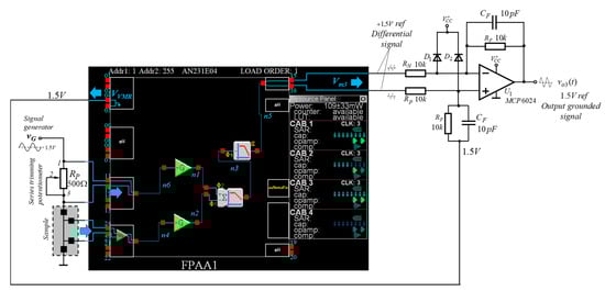 As can be seen in Figure 3, an input copper amplifier, programmable difference amplifiers, subtractor and various types of filters are required for the implementation of the block diagram given in Figure 2. Such functional blocks can be obtained by using the standard CAMs available in the FPAA AN231E04. Moreover, the basic electrical parameters of the chosen CAMs can be dynamically adjusted according to the types of the samples, connected in the input voltage divider, by setting them in the framework of the ANADIGM DESIGNER 2 program. Additionally, programmable electrical connections were built between the individual modules and the input/output blocks.
