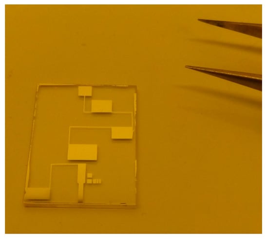 For the application of the 3ω method, a specific four contact point measurement structure consisting of a thin and long wire patterned film under study (similar to microheater) was prepared by lift-off reverse photolithography. The film of interest was grown by spin-coating onto preliminary patterned photoresist. Two of the square contact pads were intended for supplying the structure with an alternative current passed through the layered microheater-like strip of lead-free perovskite. The remaining two contact pads were used for extracting a useful signal (Figure 4).