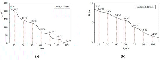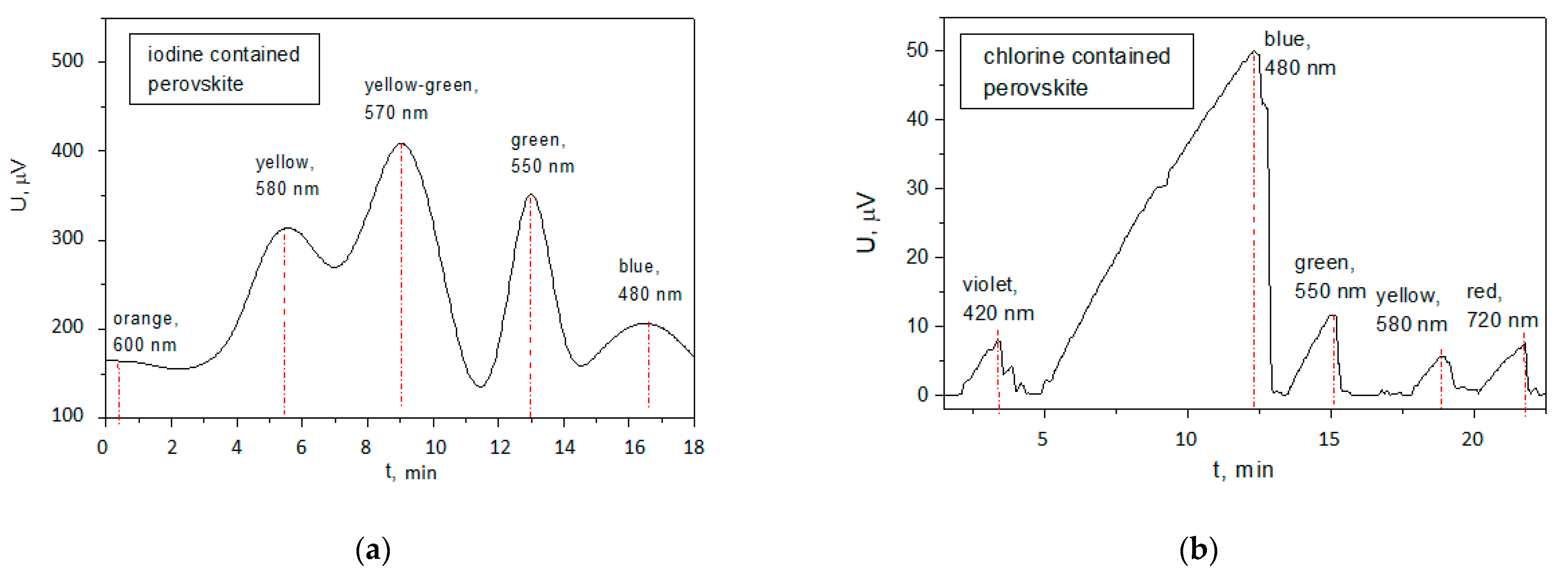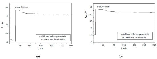 Iodine-based perovskite cell exhibited the highest photovoltage of 410 µV for a yellow-green light with a wavelength of 570 nm. For the chlorine-based perovskite, the maximum photovoltage was 49.6 µV at 480 nm (blue band). For this reason, a measurement was set for investigation of the stability of the open circuit photovoltage against time at continuous illumination with the light intensity and respective spectrum for which the corresponding cell exhibited the greatest photovoltage (Figure 8).