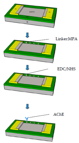 For the first step of functionalization, 25:75 (v:v) water/ethanol solution within 70 mM MPA was dripped onto the sensor sensitive area for about 9 h, in order to establish the Au-MPA SAM. Then the chip was washed thoroughly by the 1:3 ethanolic solution and dried by N2 gas. For the second step of functionalization, EDC/NHS activation was conducted to activate the NHS. This solution was dropped onto the gold gate surface and left for 4 h. For the third step of functionalization, the samples were again thoroughly washed by PBS buffer, after which we immediately dropped 50 µL of 2 mg/mL AChE on the FET’s gate area which had been activated. For the fourth step of functionalization, we kept the samples for drying at room temperature for around 12 h, in order to let the liquid evaporate. When the functionalization steps were finished, the samples were washed by PBS buffer and stored at 4 °C in the laboratory refrigerator. The functionalization was performed on the entire sensor surface, after which the active graphene area would be surrounded by silicone rubber. The functionalization sequence is shown in the Figure 3.
