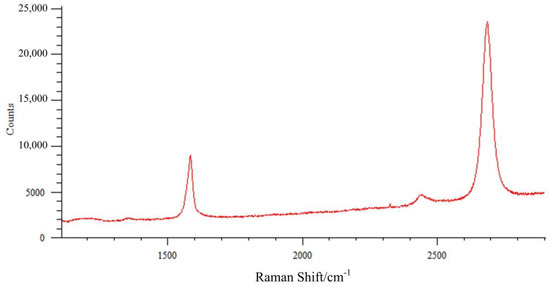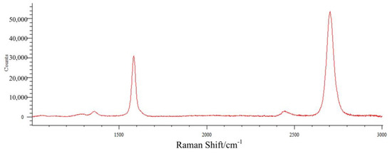 In order to present and study the sensor material’s performance, we conducted Raman spectrum and atomic force microscopy (AFM) scanning for this biosensor. The Raman spectra of graphene on the electrode area, and on the silicone substrate area are shown in Figure 5 and Figure 6, respectively. Usually the graphene Raman spectrum has two peaks. The left peak is the G peak, and the right peak is the 2D peak. In our graphene Raman spectrum, the G peak is about 1583.41/cm2, and the 2D peak is about 2705.71/cm2. The multi-layers graphene would have different Raman spectrum peaks compared with single-layer graphene; when the layers increase the G peak would decrease, while the 2D peak would increase. The Raman spectrum peaks have been explained recently by the spectrum analyses in references [23,24].
