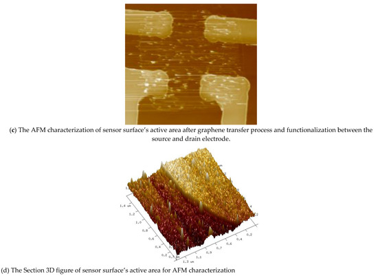 In summary, from the AFM characterization we could observe the sensor surface’s condition for both graphene and electrodes, and we could also observe the surface morphology by AFM’s special features. The entire sensor chip size was 1 cm × 1 cm during the characterization and the following measurement, while the electrode width was about 1 mm (Figure 7b,c). Figure 7b shows the sensor surface’s active area before the graphene transfer process, while Figure 7c shows the sensor surface’s active area after the graphene transfer process. Figure 7a shows the sensor surface’s inactive area. Figure 7d was collected from the borderline area between the graphene nanoribbon and electrode. The scansize is 1.4 × 1.4 μm, and the scale is that one line segment represents 0.2 μm. Compared to electron microscopy, AFM could be able to represent the surface morphology of this sensor, displaying the three-dimensional perspectives of the graphene sensor surface.