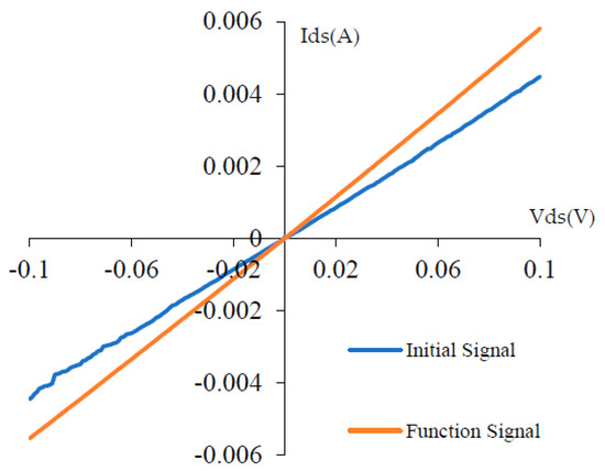 In these equations, Equation (3) describes this sensor’s I−V performance under Vg = 0 V for both the control experiment and the target detection experiment; Equation (5) presents the transfer curves under specific circumstances when we set a gate voltage Vg together with the fixed Vds. In the above equations, W and L stand for channel width and length respectively, μeff is the effective carrier mobility, n0 is the initial carrier density under Vg = 0 V situation, Vg is gate voltage, VD is threshold voltage at Dirac point, Vds is bias voltage. When we consider C−V curves, the gate capacitance would be considered. Cox stands for the oxidation layer gate capacitance, c stands for the organophosphorus solution concentration.