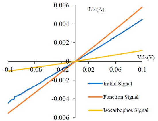 Isocarbophos is an organophosphate which has been widely used during the spread of insecticides. It is mainly used to control cotton spider, cotton aphid, cotton bollworm (larva and egg), red bollworm egg, spodoptera litura, and rice borer, and has a good effect on all kinds of scale insects. In 2022, there have been research papers about micro sensors for the rapid detection of organophosphate by some advanced means, such as electrochemical and fluorescence methods [18,19]. In our research, a graphene based organophosphate sensor could also have significant sensitivity and selectivity for rapid detection of organophosphorus pesticides. For sensor signal measurement experiments, the instrument we used is source meter Keithley 4200A-SCS, and we updated its software for sensor data processing. This Keithley instrument is developed by the Tektronix company; the 4200A-SCS is an industry-leading electrical characteristic parameter analyzer, providing synchronous current voltage curve test (I−V curves measurement) and other electrical signal measurement.