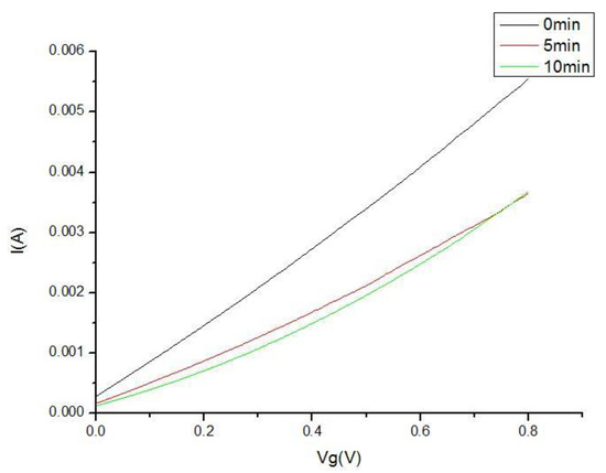 In the above formula, Ids stands for the current measured in in 1 nM acetylcholine solution after exposed in 100 μg/mL isocarbophos solution (solvent: PBS buffer). In order to study this biosensor’s detection effect, we need to compare the experiment concentration with the detection limit of the target organic phosphorous isocarbophos [34]. The I−V curves were recorded when gate voltage Vg = 0 V before and after the addition of organic phosphorous, and graphene FET transfer curve characteristics were also recorded with a fixed bias voltage. We applied 0.8 V to the solution gate chamber, and this bias voltage Vds remained at 0.1 V. The I−V curves were recorded in the Figure 9. The Keithley 4200 instrument was kept in the transfer curve sweeping and recording mode. Thus, the transfer curves of each step of the experiment were recorded and drawn for comparison. We have recorded the transfer curves of the initial signal, the thiolation signal, the function signal and target signal. For the inhibition ratio calculation, the most important is the transfer curves after adding the target organophosphorus isocarbophos [35]. In our experiment, the transfer curves were recorded when the target organophosphorus isocarbophos was added at the 1st minute, the 5th minute and the 10th minute, presenting in the Figure 10 below.