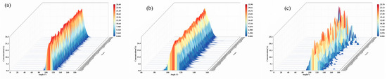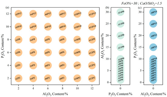 The Al2O3 and P2O5 contents in each set of simulations and the corresponding case names: (a) CaO-SiO2-FeO-Al2O3-P2O5 slag system (AP model); (b) CaO-SiO2-FeO-Al2O3 slag system (A model); (c) CaO-SiO2-FeO -P2O5 slag system (P model).