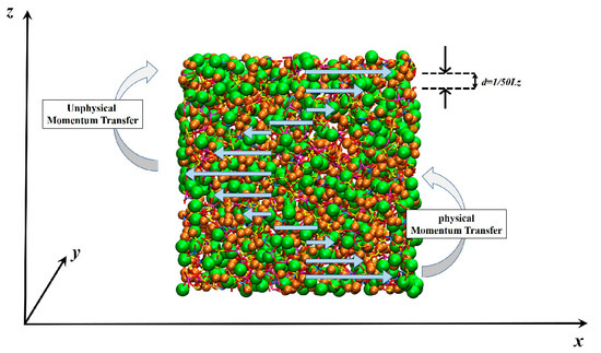 Muller-Plathe [22] proposed a method to calculate shear viscosity in terms of RNEMD, which was achieved by exchanging momentum and artificially constructing the shear field; the formulas are shown in Equations (7) and (8). The velocity gradient and shear rate can be obtained from the simulation accordingly. This method has been applied to many fields, such as nanofluids, for the calculation of thermally conductive viscosity [23,24]. In this simulation, the RNEMD method was also adopted to calculate the viscosity of different slag systems. During the calculation, the two ends were fixed, and the system was sliced along the Z-axis. 50 slices were cut. The momentum components at the center and both sides were exchanged to construct the velocity gradient and form the shear field to calculate the viscosity. The schematic diagram is shown in Figure 2. During the calculation, the slag was considered as a liquid state. The solid fraction was not introduced in the model, which may cause some inaccuracies.