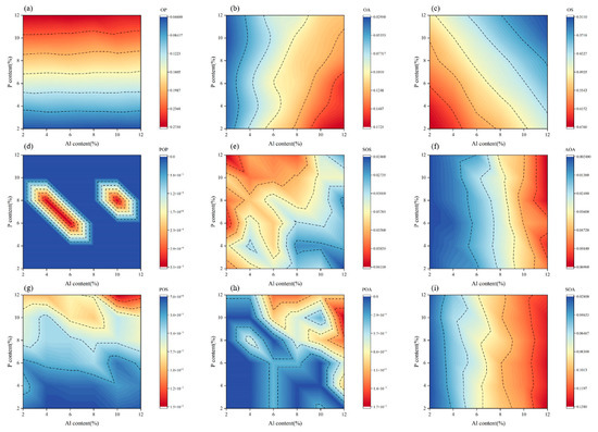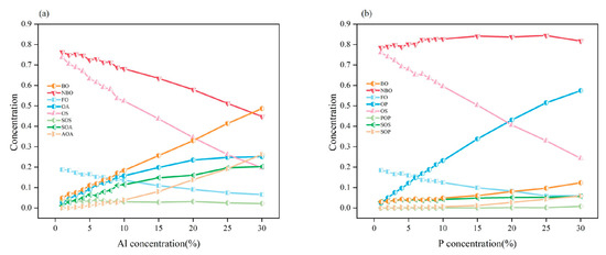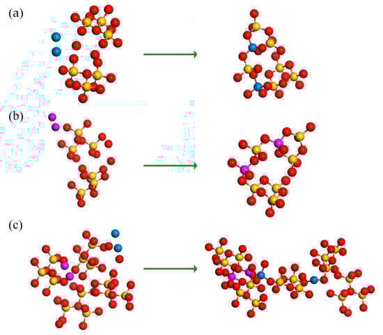 Figure 6 shows the effects of Al2O3 and P2O5 on different types of NBO and BO in the slag. For the NBO, the content of OP increases with the increase in P2O5 content. The increase in Al2O3 content hardly affects the content of OP. The increase in Al2O3 content leads to the increase in OA content, but the increase in P2O5 content slightly decreases the content of OA. Combined with the changing trend of BO, it can be obtained that when the P2O5 content increases, the P atom combines with OA to form POA-type bridging oxygen. The depolymerization effect of Ca2+ and Fe2+ on the structure of AOA [34] also results in a higher OA content at low P content and high Al content in the slag. The increases in Al and P content also have the same reducing effect on the OS content. These OS structures will polymerize into structures such as SOA and SOP accordingly. As for BO, POP hardly appears. The AOA content increases with the increase in Al content. The AOA structure can be influenced by the depolymerization effect of Ca2+ and Fe2+, while the P2O5 content barely affects the AOA structure. In the slag system with low Al and high P contents, the SOS-type BO is easier to be formed. While high Al and low P content reduce the SOS content on the other hand. The POS-type bridging oxygen is only observed in the slag system with higher P2O5 content. When the Al content increases, Al content promotes the production of POS-type BO. The POA-type BO exists in the slag system with high Al and P contents. The SOA-type BO increases with the increase in Al content. Figure 7 shows the reaction mechanism of the oxygen network structures under the effects of P and Al atoms.