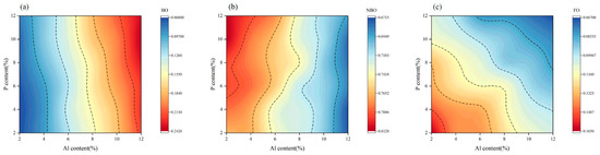 Figure 5 shows the changing trends of BO, FO, and NBO in the AP model. For the BO content, when the Al2O3 content is fixed, the BO content barely increases with the increase in P2O5 content. When the P2O5 content is fixed, the BO content increases significantly with the increase in Al2O3 content. For the NBO content, when the Al2O3 content, the increase in P2O5 content impels the NBO content to increase slightly. When the Al2O3 content is fixed, the content of NBO decreases as the content of Al2O3 increases. Some of the NBOs transfer to BO with the assistance of Al3+. For the FO content, the increase in both Al2O3 and P2O5 content decreases the FO content in the slag. The covariances between the different oxygen types and the content of Al2O3 and P2O5 were analyzed. The results are shown in Table 2. There is a strong positive correlation of Al2O3 with BO but a strong negative correlation with NBO. The Al2O3 and P2O5 contents also showed the same negative correlation for FO.
