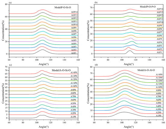 Figure 8 and Figure 9 show the bond angle distributions in the [SiO4], [PO4], and [AlO4] structures at 1873 K for the A model, P model, and AP model. In A model and P model, it can be seen that the bond angles of O-Si-O are around 109.0–109.1°, which is close to the standard tetrahedral structure of 109.5°. The bond angles of O-P-O fluctuate in the range of 109–116°. The bond angle of O-Al-O stabilizes after the Al content becomes larger and forms a stable structure. In the AP models, both O-P-O and O-Si-O bond angles are more stable and close to the ideal tetrahedral structure bond angles. The O-Al-O bond angles fluctuate in the range of 102°–113°. Combined with the analysis of oxygen types in the previous section, it can be seen that the presence of both P and Al will affect the degree of polymerization to some extent. However, these two atoms have little effect on the bond angles of O-P-O, O-Al-O, and O-Si-O.