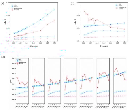 Viscosity changes of different element content under different models: (a) A model; (b) P model; (c) AP model.