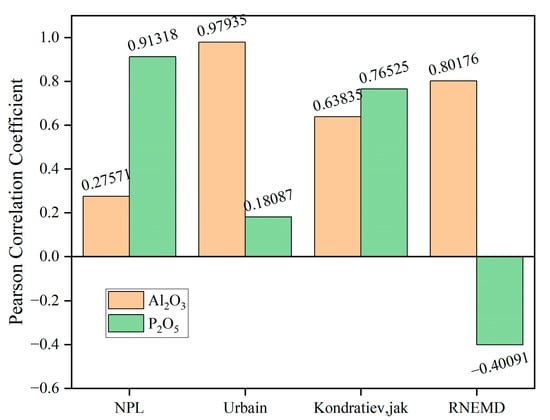 Pearson correlation coefficients between different model viscosities and Al2O3 and P2O5 contents.