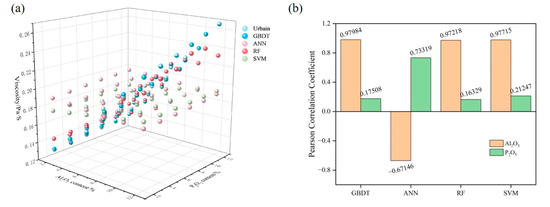 Machine learning results: (a) Prediction results of viscosity by different ML models; (b) Pearson correlation coefficient of Al2O3, P2O5, and viscosity.