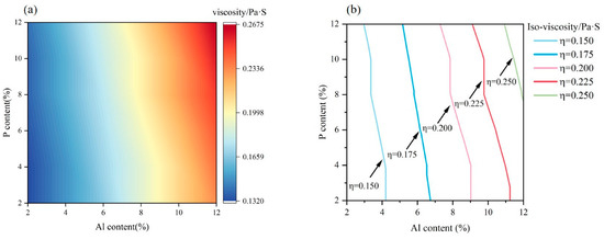 Based on the ML model with GBDT methods, a color-map concerning the numerical effect of Al2O3 and P2O5 contents and slag viscosity is provided in Figure 13a. The blue color represents the smaller value of viscosity. The red color represents the larger value of viscosity. The iso-viscosity lines with a viscosity of 0.15Pa·s, 0.175Pa·s, 0.2Pa·s, 0.225Pa·s, and 0.25 Pa·s were also extracted in Figure 13b. According to this figure, the slag viscosity of the CaO-SiO2-FeO-Al2O3-P2O5 slag system in terms of different Al2O3 and P2O5 contents can be predicted and it could also be used for composition engineering to fulfill a certain demand on the viscosity design.