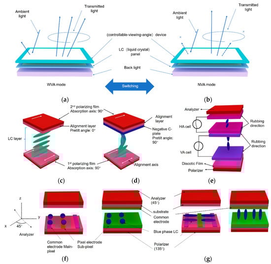 In the MVA or PVA devices, in the dark state, to improve the brightness uniformity in the gray levels, the addition of a compensation film is for suppressing light leakage. In the film compensation method, to compensate for the dark state, a negative C plate and positive A plate are introduced for compensating for the dark state, a WVA with the contrast ratio over 10 is extended from 30° to 80° of polar angle is achieved [16]. The double-cell display is mainly composed of a vertically aligned LC layer for displaying information, a homogeneous aligned LC layer replacing the positive A plate for viewing angle switching, and a negative C plate for compensation under crossed polarizer [16]. Without electric field, the vertically aligned LCs with negative dielectric anisotropy tilt down to make an angle of 45°, the optic axis of the homogeneous aligned LC layer with positive dielectric anisotropy is parallel to the analyzer’s transmission axis, thus light transmitting through negative C plate and double LC cells is blocked by the analyzer, additionally, light leakage can be suppressed by homogeneous aligned LC cell and negative C plate [16]. For viewing angle switching, the mid-director of the homogeneous aligned LC layer is controlled by a vertical electric field (Figure 2e) [16], the high image quality in share mode has a polar viewing angle of 30° in the horizontal direction. However, this approach for tuning viewing angle requires additional components, leading to higher thickness and higher production cost.