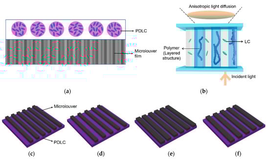 Utilizing 3M light-control film and PDLC film together to create switchable anti-peeping film, PDLC is a voltage-controlled LC film that can switch between transparent and scattering (Figure 3a), light scattering intensity of PDLC film is dependent on electric field, switchable voltage between light scattering (share mode) and transparent state (privacy mode) is approximately 5.0 V [31]. As 3M light control film and PDLC film are not integrated, a control method for light distribution patterns of PDLCs is established by controlling an internal polymer structure formed by irradiating unidirectional diffused UV light in isotropic phase (Figure 3b) [32]. To investigate the effect of micro-louver size on the viewing angle controllable ability, four micro-louver structures with the same thickness are fabricated by utilizing thiol-ene photopolymerization (40-40 μm, 40-60 μm, 60-40 μm and 60-60 μm) (Figure 3c–f), four controllable anti-peeping devices can realize WVA and NVA modes at 0 and 8 V [33]. However, external switchable anti-peeping films need to be installed on the screen, to solve this problem, the LCD containing the switchable anti-peeping film is fabricated based on PDLC, the propagation direction of the light passing the 3M light control film can be tuned by the PDLC film, the NVA mode is presented without electric field and WVA mode is shown in the application of electric field (24 V) [34].